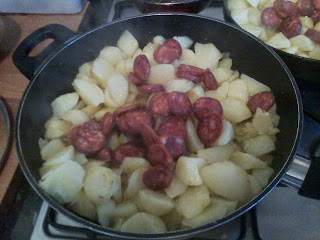When the potates are half cooked add the chorizo and finish fying everything up.
